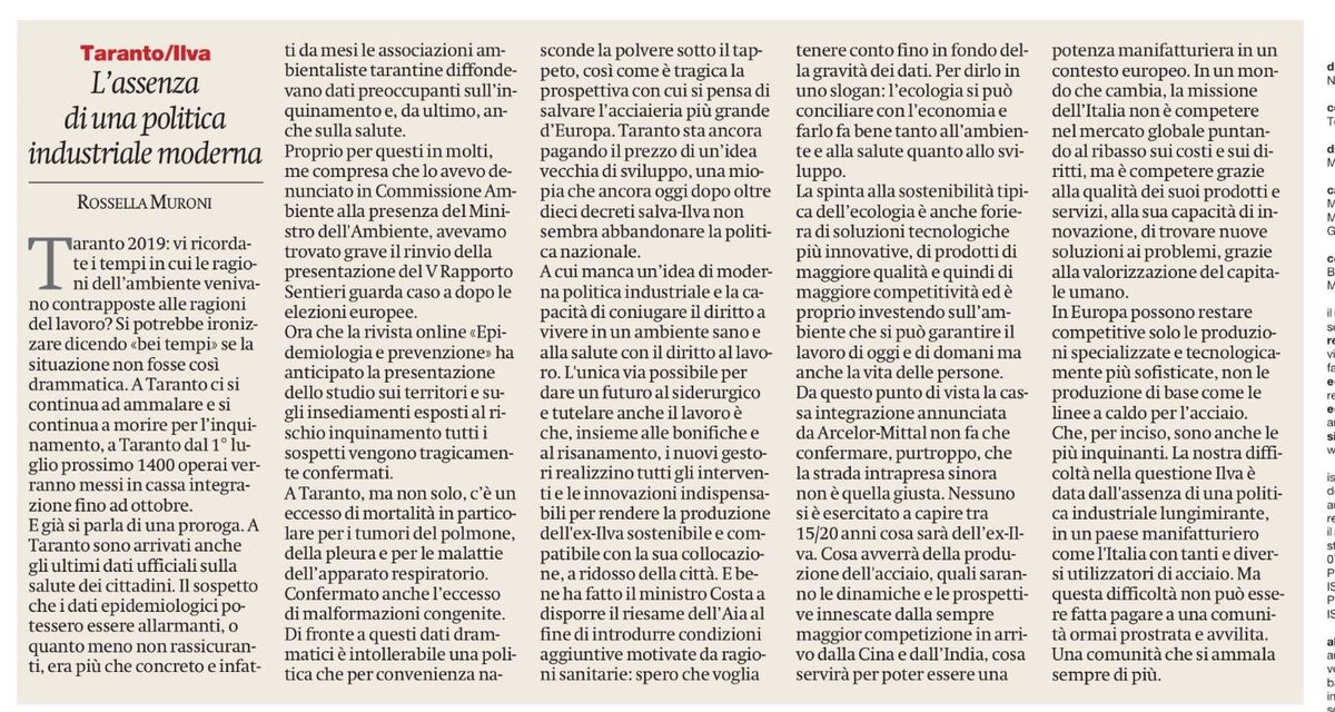 Perché l’ecologia si può conciliare con l’economia e farlo fa bene tanto all’ambiente e alla salute quanto allo sviluppo. La spinta alla sostenibilità tipica dell’ecologia è anche foriera di soluzioni tecnologiche più innovative, di prodotti di maggiore qualità e quindi di maggiore competitività ed è proprio investendo sull’ambiente che si può garantire il lavoro di oggi e di domani ma anche la vita delle persone. Una ricetta valida anche per l’ex-Ilva e per Taranto. Che la politica dovrebbe finalmente applicare. Perché non è più tollerabile che di lavoro ci si continui ad ammalare.